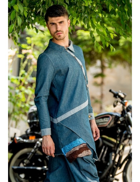 De ce sa porti o camasa clasica? Iti propunm camasa KARP, realizata din denim, cu taietura asimetrica si inchidere cu nasturi metalici. Detaliile stau in contrast